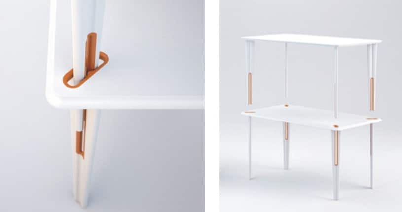 La forma dei due tavoli è studiata in modo che le gambe del primo si incastrino a croce con quelle del secondo mentre i bordi sono perfettamente speculari. Il tavolo inferiore è provvisto di fori per permettere il passaggio delle gambe di quello superiore.