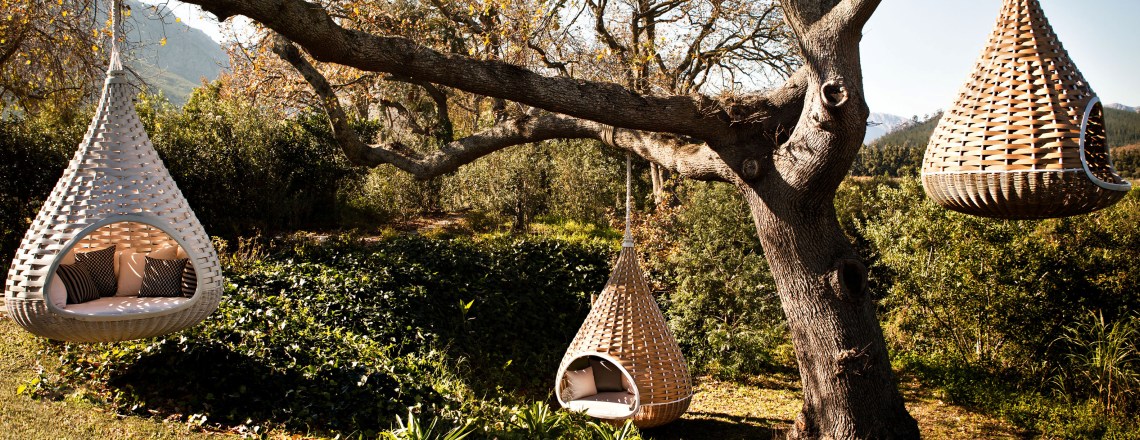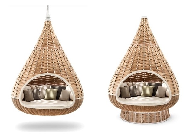 Grazie alla sua struttura armoniosa, accogliente e protettiva, trasforma il tipico divano da giardino in una mini-architettura, in un luogo sospeso, appartato, avvolgente, che dondola e rassicura come un abbraccio, ideale per momenti di relax, meditazione e conversazione en plein air.