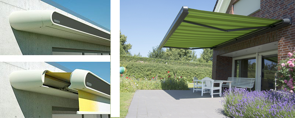 Questa tenda da sole, da chiusa sembra una piccola tettoia con faretti, perfetta per sporgersi sul balcone ed essere riparati in caso di pioggia, ma anche per illuminare la sera i nostri spazi esterni con raffinatezza. Da aperta offre un’ombreggiatura per una superficie di oltre sette metri per quattro. Nonostante le sue abbondanti misure, appare leggera e affascinante, e sono tante le caratteristiche di allestimento: lo scolo dell’acqua mediante una grondaia integrata nel profilo frontale, il radiatore termico per ottenere un caldo piacevole quando l’aria si fa fresca, i sensori di sole e vento che selezionano automaticamente il comportamento adeguato in funzione del tempo atmosferico, così la tenda si aprirà automaticamente allo splendere del sole e si chiuderà in presenza di venti molto forti.